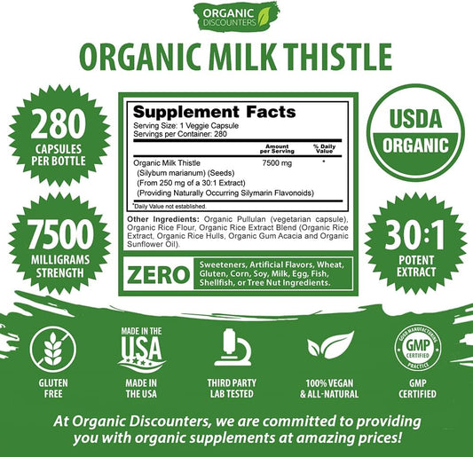 USDA Certified Organic Milk Thistle Capsules - 280 Count, 7500mg Strength, Vegan & Non-GMO - Rich in Silymarin Flavonoids - All-Natural Herbal Supplement