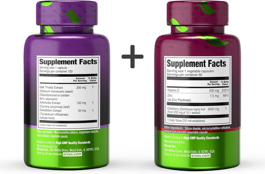 Bundle: ORZAX Milk Thistle Plus, Dandelion, Artichoke, and Elderberry Capsules - 120 Veg Capsules, 2000mg Sambucus