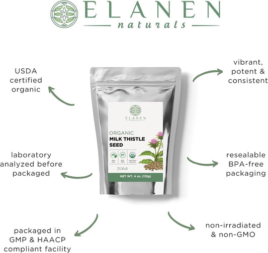 Elanen Naturals Organic Milk Thistle Seeds 4 oz - USDA Certified Semillas de Mariano - Bulk Dried Silybum Marianum Seeds