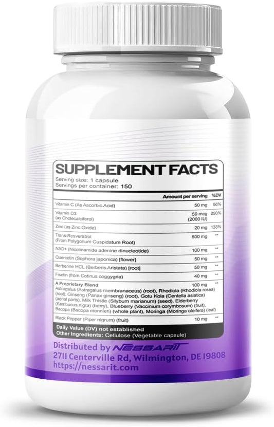NESSARIT Resveratrol Supplement with NAD, Milk Thistle, Astragalus, Rhodiola, Gotu Kola, Elderberry, Blueberry - 150 Count - USA Made & Tested