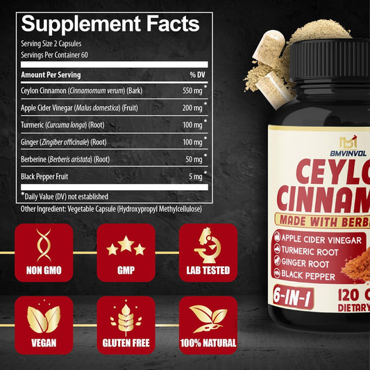 6in1 Ceylon Cinnamon Capsules with Berberine HCl, Turmeric, Ginseng, Black Pepper, Apple Cider Vinegar - 120 Count for Immune Support