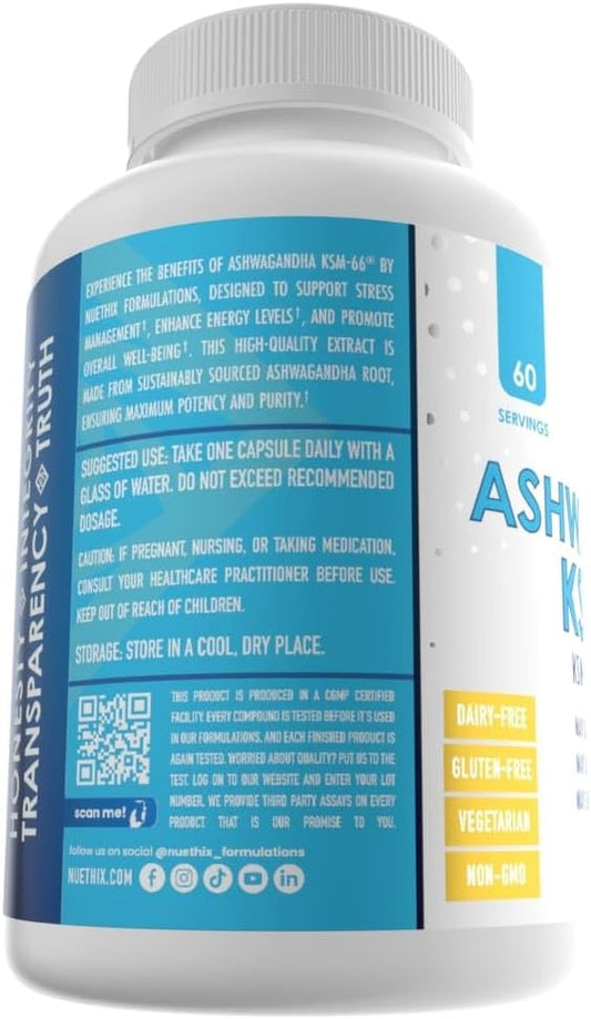 500mg NuEthix Formulations Ashwagandha KSM-66 Root Extract with BioPerine for Mood, Stress, & Cognitive Support - Gluten Free, Vegetarian, Non-GMO, Dairy Free - 60 Servings