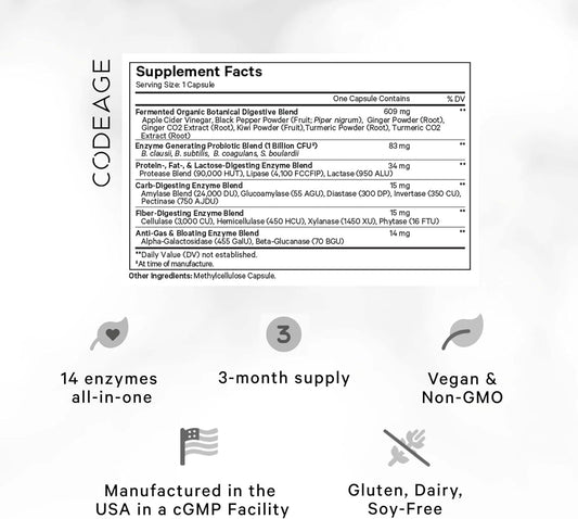 Plant-Based Digestive Enzymes Supplement - 3-Month Supply - 14 Enzymes, Probiotics, Prebiotics - 90 Capsules