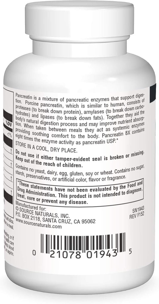 Premium Source Naturals Pancreatin 8X 500mg Dietary Supplement - 50 Capsules