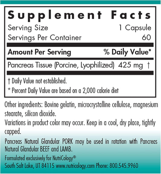 Nutricology Pancreas Pork 425mg Supplement - Natural Pancreatic Enzymes for Digestion - 60 Capsules