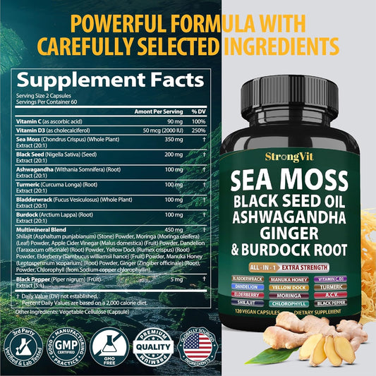 Organic Sea Moss Capsules with Black Seed Oil, Ashwagandha, Ginger, Burdock Root, Bladderwrack, Turmeric, Shilajit - Multimineral Supplement (120 Caps)