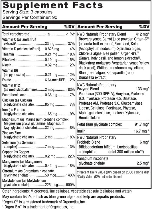 270 Capsules NWC Naturals Total-Nutrition Multivitamin with Enzymes, Prebiotics & Probiotics - Vegetarian Whole Food Vitamins for Men & Women