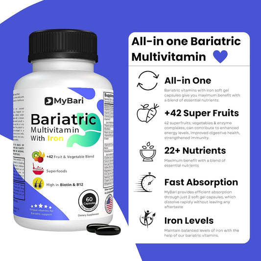 USA-Made MyBari All-in-One Bariatric Multivitamin with Iron for Men & Women - Supports Gastric Sleeve & Bypass - 60 Liquid Capsules with 42+ Fruit & Veggie BlendVendor:MyBariRegular price $89.62 AUDRegular priceUnit price / per-