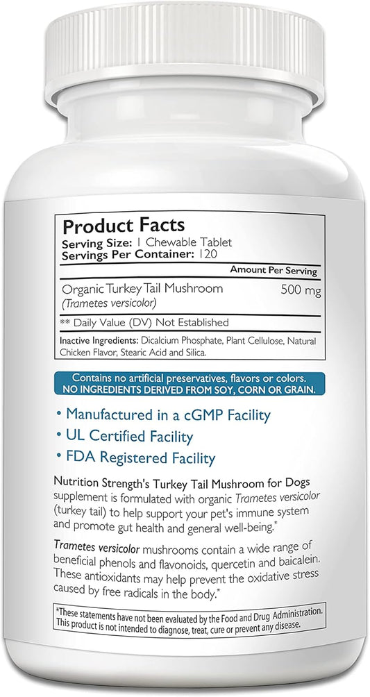 Turkey Tail Mushroom Supplement for Dogs: Immune Support, Gut Health, Antioxidants, Inflammation Relief, Energy Boost - 120 Chewable Tablets