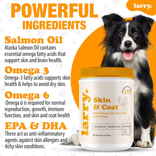 Larry's Salmon Oil Soft Chews for Dogs | Omega 3, 6, DHA, EPA Supplement for Skin, Coat, Joint Health | Itchy Skin & Allergy Relief | All Breeds & Sizes | 120 Chews