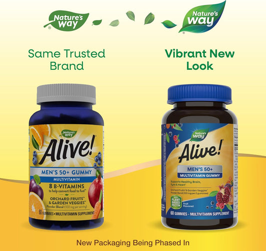 Alive! Men’s 50+ Gummy Multivitamins - Supports Brain, Eyes, Heart - B-Vitamins - Gluten-Free - Vegetarian - Fruit Flavored - 60 Gummies