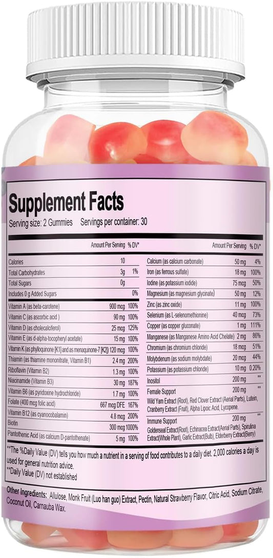 Sugar Free Women's Multivitamin Gummies 14+ with Inositol, Iron, Folate, Biotin - Strawberry Flavored Daily Multivitamin for Hair, Skin, Energy, and Immune Support