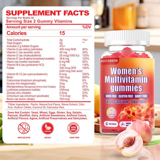 Peach Flavored Women's Multivitamin Gummies with 6 Essential Vitamins and Minerals for Skin, Hair, Energy, and Immune Support (60 Count)