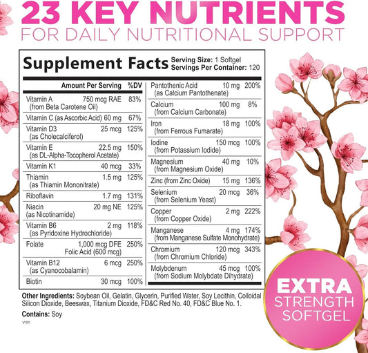 Women's Multivitamin with Iron, Calcium, Zinc, Vitamins A, C, D, E, B - Supports Bone, Skin, & Immune Health - 120 Softgels