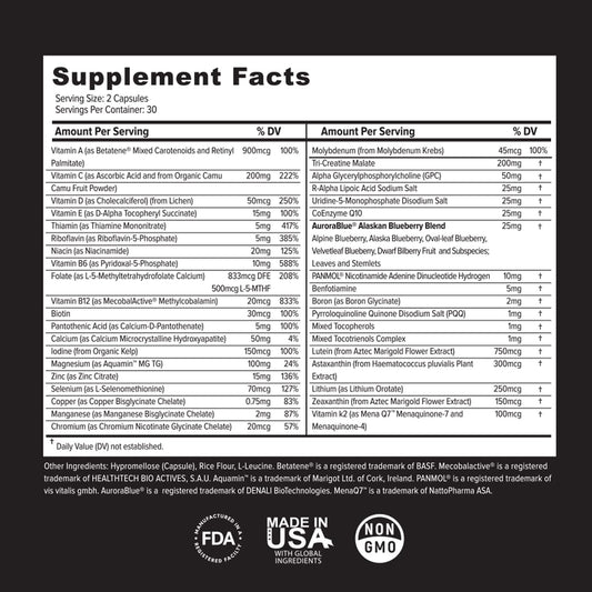 Natural Sugar-Free Whole Food Multivitamins for Adults & Seniors - 2X Daily with Vitamin A, C, D3 - 60 Capsules (30 Servings)