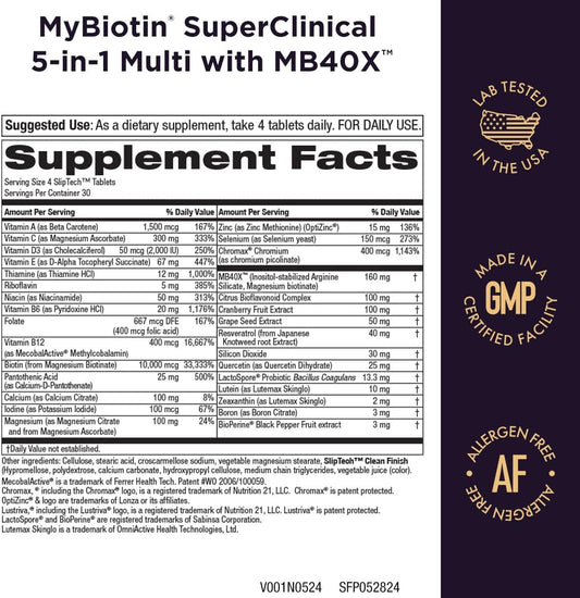 SuperClinical 5-in-1 Elite Multivitamin with MB40X Biotin Matrix - Thicker Hair in 3 Weeks - 40X More Soluble - 120 Tabs