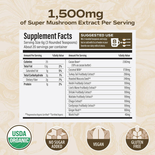 Organic Certified 7 Mushroom Mocha Blend with Turkey Tail, Reishi, Lion's Mane, Shitake, Maitake, Chaga & Cordyceps