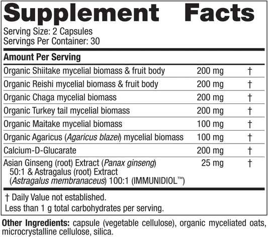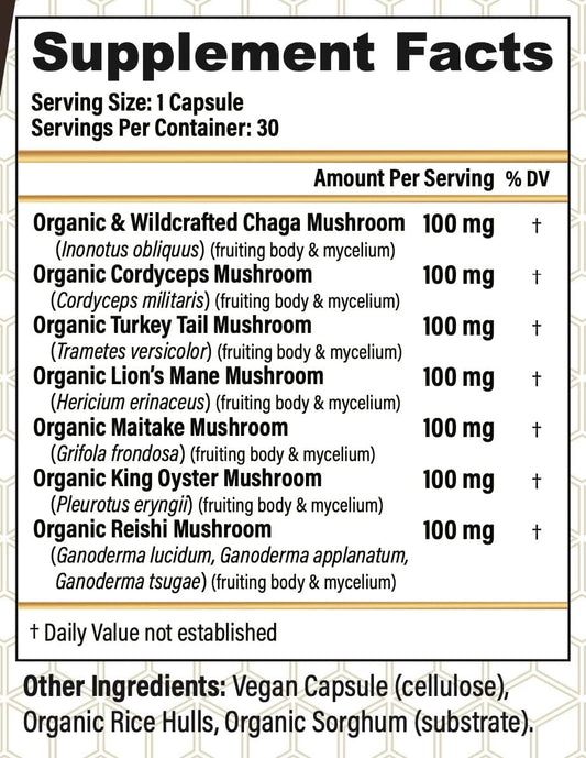 Organic Mushroom Supplement with Cordyceps, Reishi, Lion's Mane, and More - 30 Vegan Capsules
