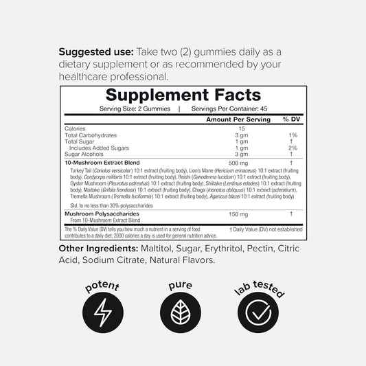 Ultra High Potency 10:1 Extract Mushroom Gummies with Lion's Mane, Chaga, Reishi - 90 Gummies