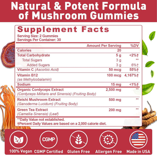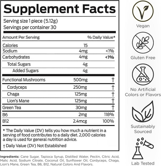 Mushroom Gummies for Adults with Lions Mane, Cordyceps, Chaga, B6, B12, Green Tea - Focus Supplement by Get Up Gummy