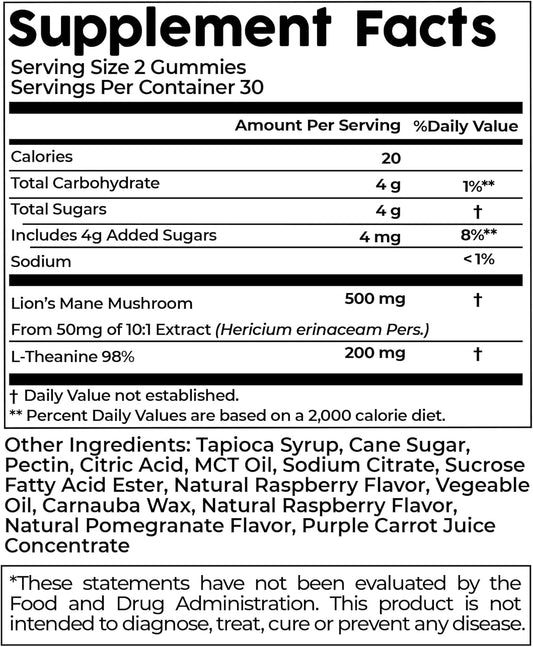 Nutroaid Lions Mane Mushroom Gummies with L-Theanine for Focus & Energy - Raspberry & Pomegranate Flavor - 60 Gummies