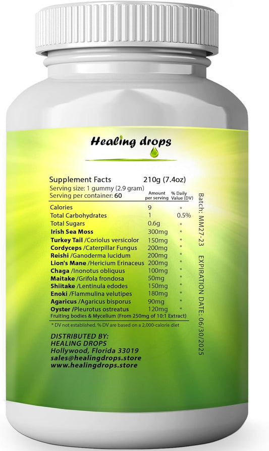 High Potency Healing Drops Mushroom Gummies with Sea Moss - 10 Mushroom Blend Supplement (60 Gummies)