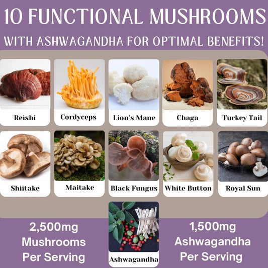 Organic 10 Mushroom Supplement with Reishi, Lions Mane, Cordyceps, Turkey Tail, Maitake, Shiitake - Nootropic Blend