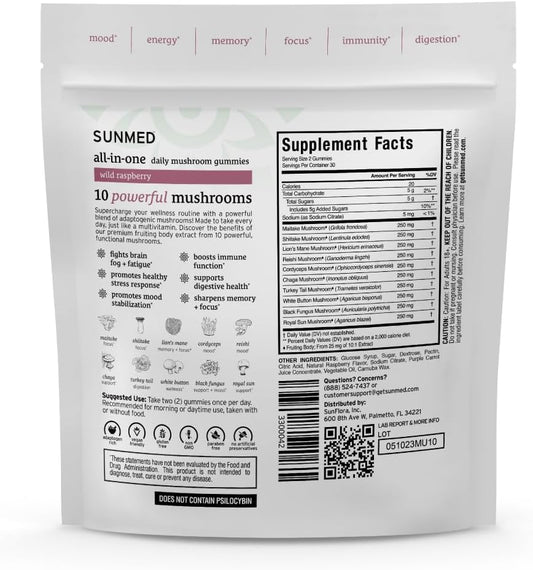 Enhance Focus and Mood with SUNMED All-in-One Mushroom Gummy Supplements - 60ct Cognitive and Immune Support with Wild Raspberry Flavor