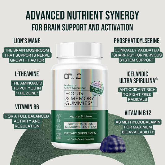 Focus & Memory Nootropic Gummies for Adults - Lion’s Mane, L-Theanine, Phosphatidylserine, Spirulina, Vitamins B6 & B12 - 60 Gummies