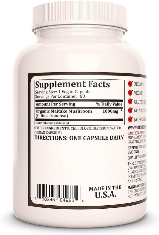 Organic Maitake Mushroom Capsules | 1,000 mg 60 Vegan Pills | Two Month Supply | Non-GMO, Gluten-Free, Dairy-Free