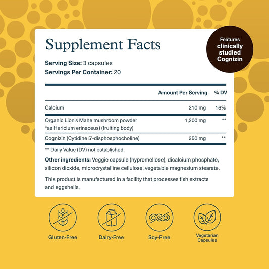 Lion's Mane Plus Mushroom Supplement with Cognizin - Promotes Focus & Brain Health - 60 Capsules