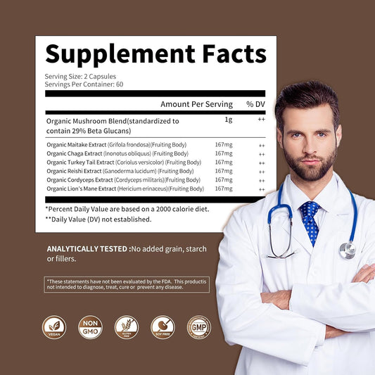 Premium Nootropic Mushroom Complex Supplement - 10 Mushrooms Blend for Brain, Energy, and Focus - 2600mg, 120 Capsules