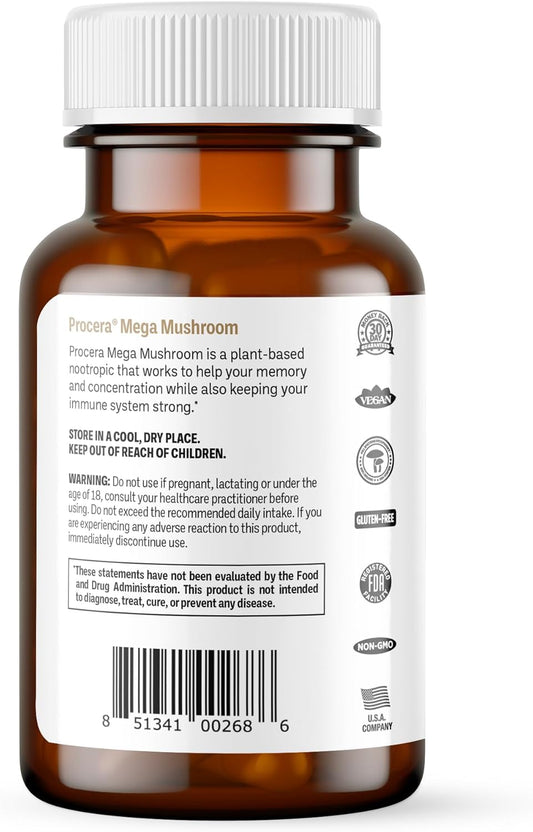 Procera Mega Mushroom Capsules - Boost Memory, Energy, & Clarity - Immune Support & Detox - Lions Mane, Chaga, Cordyceps, Shiitake, Turkey Tail - 60 Count