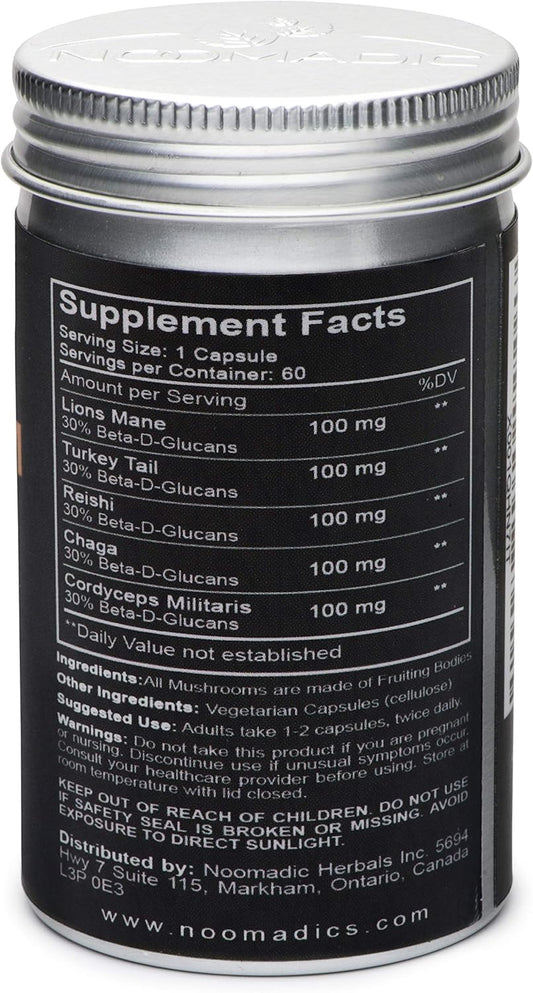 Organic Mushroom Complex Capsules - Lions Mane, Turkey Tail, Chaga, Reishi, Cordyceps - 30% Beta Glucans - 60 Count, 500mg