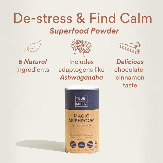 Organic Mushroom Superfood Powder with Ashwagandha, Reishi, and Chaga - Natural Calm, Brain Health, Immune Support - 30 Servings