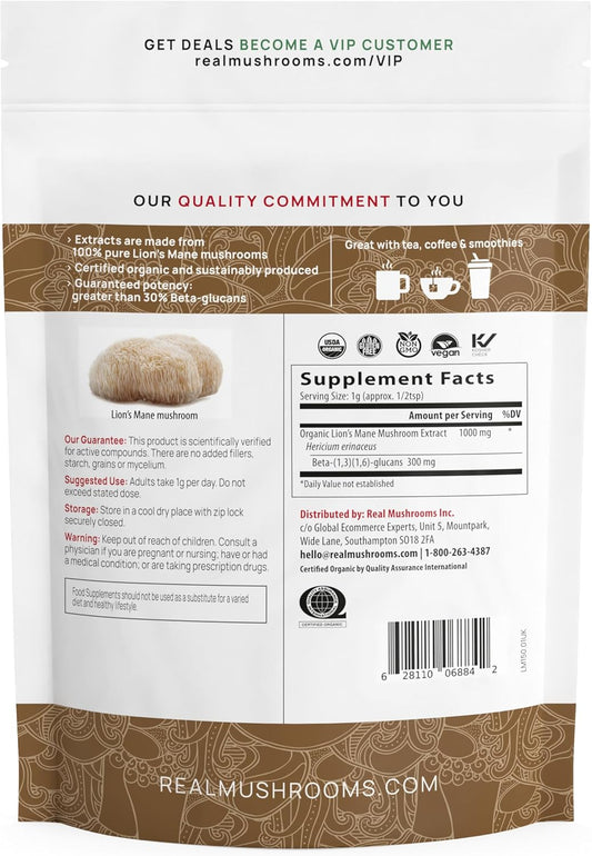 Organic Lions Mane Mushroom Powder for Cognitive Function and Immune Support - Vegan Brain Supplement with Memory and Focus Benefits, 150 Servings