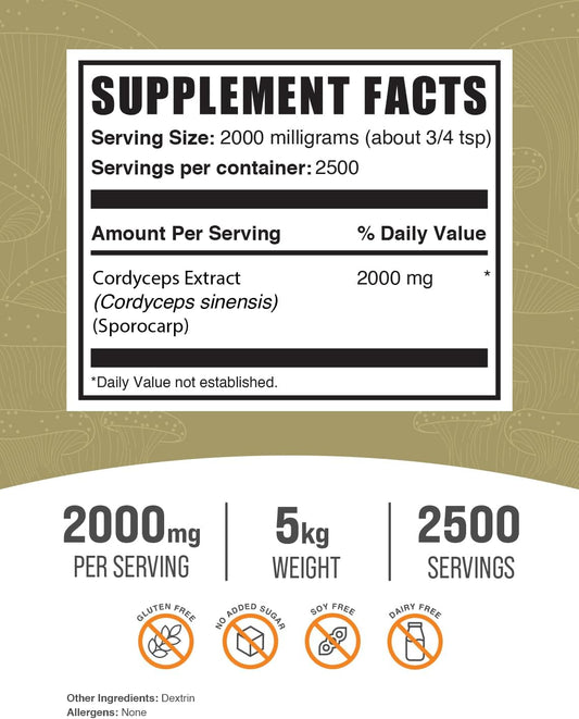 BulkSupplements.com Cordyceps Mushroom Extract Powder - Gluten-Free Cordyceps Sinensis Powder - 2000mg per Serving - 5kg (11 lbs) - Pack of 5