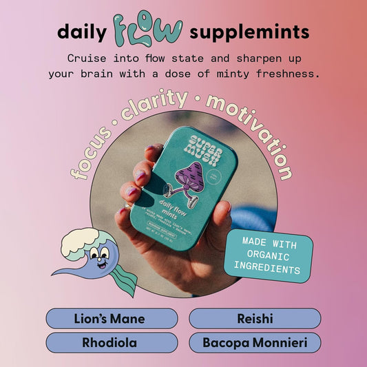 Organic SuperMush Daily Flow and Focus Mint Supplement with Lions Mane, Reishi, Rhodiola & Bacopa Monnieri Extracts - 20g
