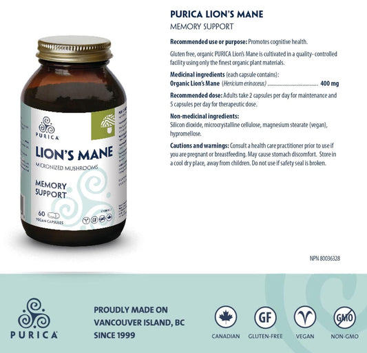 PURICA Lion's Mane Micronized Mushrooms Capsules - 60 Vegan Pills for Cognitive Health, Focus, and Memory Boost