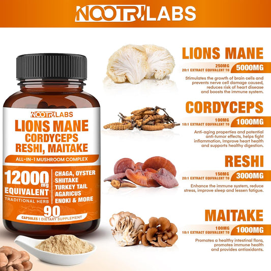Nootrilabs Naturals Mushroom Complex Capsules - Lions Mane, Cordyceps, Reshi, Maitake - Brain Boost, Memory, Energy, Focus - 90 Capsules