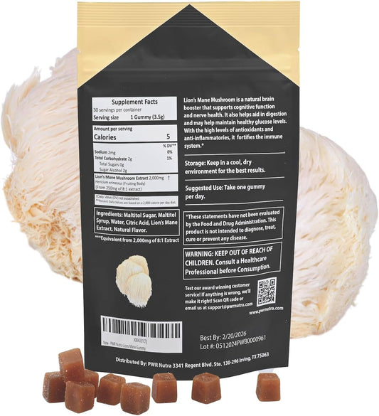 PWR Nutra Lion’s Mane Mushroom Gummies - Heart, Immunity, Brain Support - Vegan, Sugar-free, Gluten-free - 30 Servings