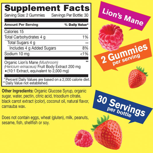Lion's Mane Gummies 2000mg for Memory & Focus | Gluten Free, Non GMO | Berry Flavor | Lions Mane Supplement 60 Count