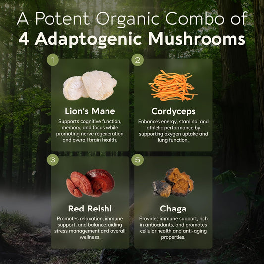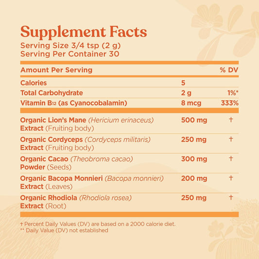 Organic Lion's Mane Focus Blend with Adaptogens & Mushroom Blend | Cordyceps, Rhodiola, Bacopa, Mucuna | 30 Servings