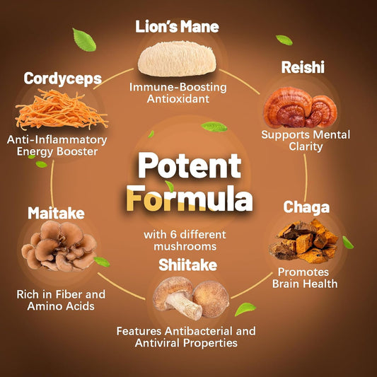 Mushroom Complex Capsules with Lions Mane, Cordyceps, Chaga, Reishi, Turkey Tail, Maitake, Brain Support Supplement for Memory and Focus - 60 Day Supply