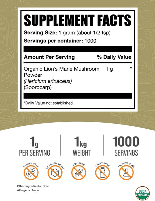 Organic Lions Mane Mushroom Powder - 1000mg per Serving, Gluten Free Supplement Powder - 1kg (2.2 lbs) Pack of 1