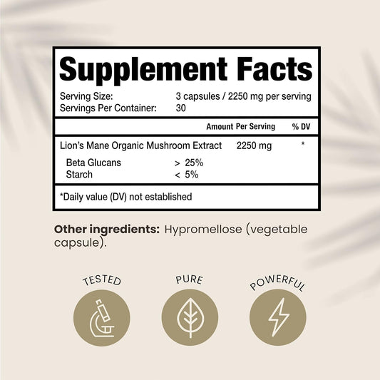 Potent Lion's Mane Mushroom Extract Capsules - Natural Nootropic for Memory & Focus - Immunity Booster - 2250mg, 90ct - HPD Rx