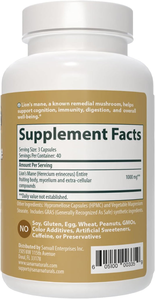 Sanar Naturals Lions Mane Supplement Capsules - Enhances Brain Function, Focus, Memory - Immune Health Support - Mushroom Lions Mane Powder - Non-GMO, Gluten-Free, 120 Pills