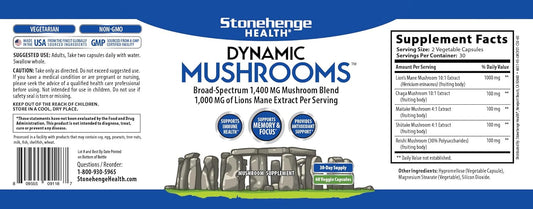 Stonehenge Health Dynamic Mushrooms - 100% Fruiting Bodies & Extracts - Nootropic Brain & Immune Support - Lion’s Mane, Chaga, Maitake, Shiitake, Reishi - 60 Capsules