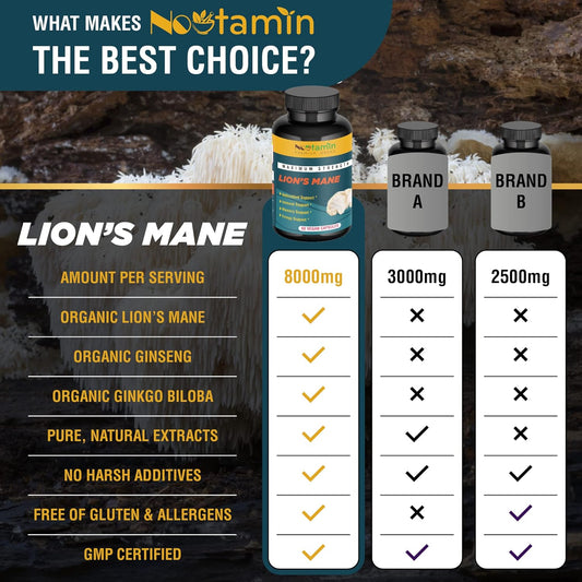 Organic Lions Mane Mushroom Capsules 8000mg - Nootropic Brain Support with Ginkgo Biloba and Panax Ginseng - Memory, Focus, Immune Boost