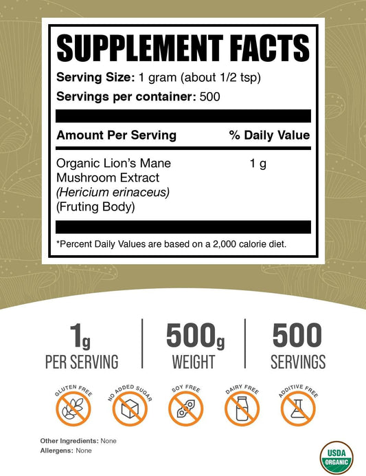 Organic Lion's Mane Mushroom Extract Powder - 1000mg per Serving, 500g (1.1 lbs) - Lions Mane Supplement